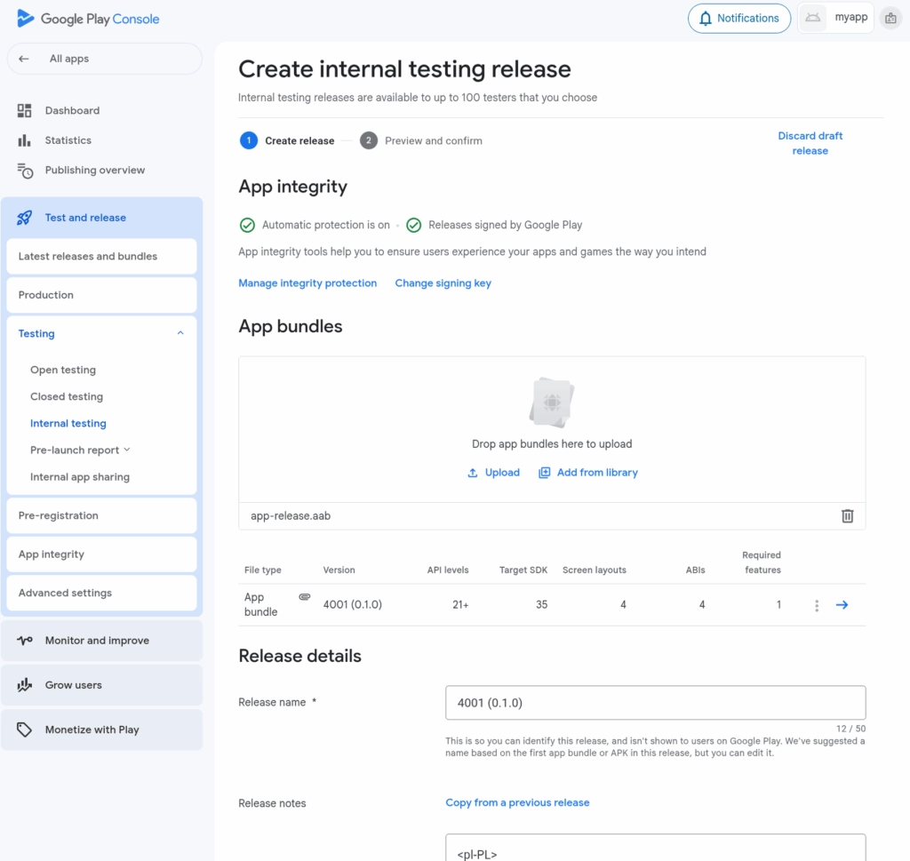 - Upload your Android App Bundle (.aab) to Google Play Console
