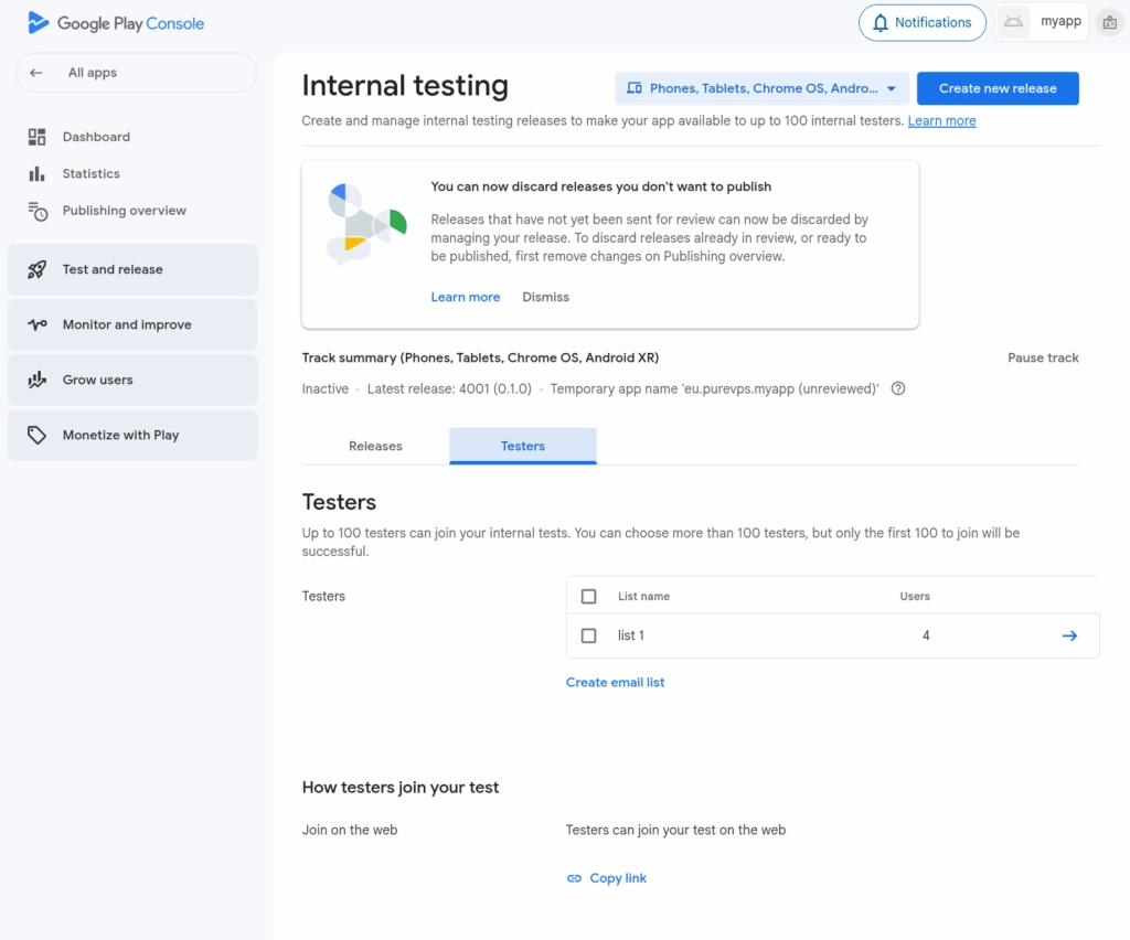 - Opt‑in URL: Click Copy link and share it via email, Slack, or social media. Testers must sign in with the same address you added.